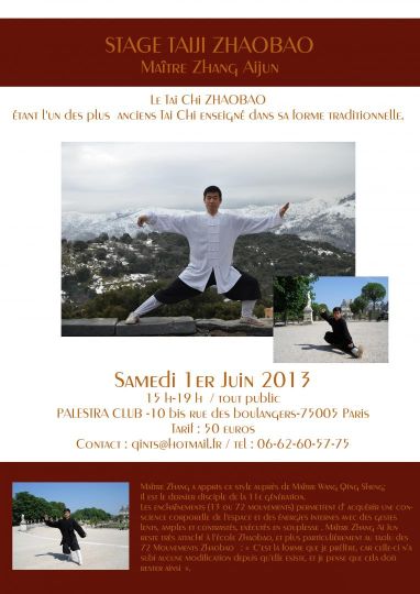 Stage de Taiji Zhaobao, le 1er juin 2013 Rendez-vous samedi 1er juin 2013 de 15h à 19h pour un stage de Tai Chi style Zhaobao Précédent Suivant